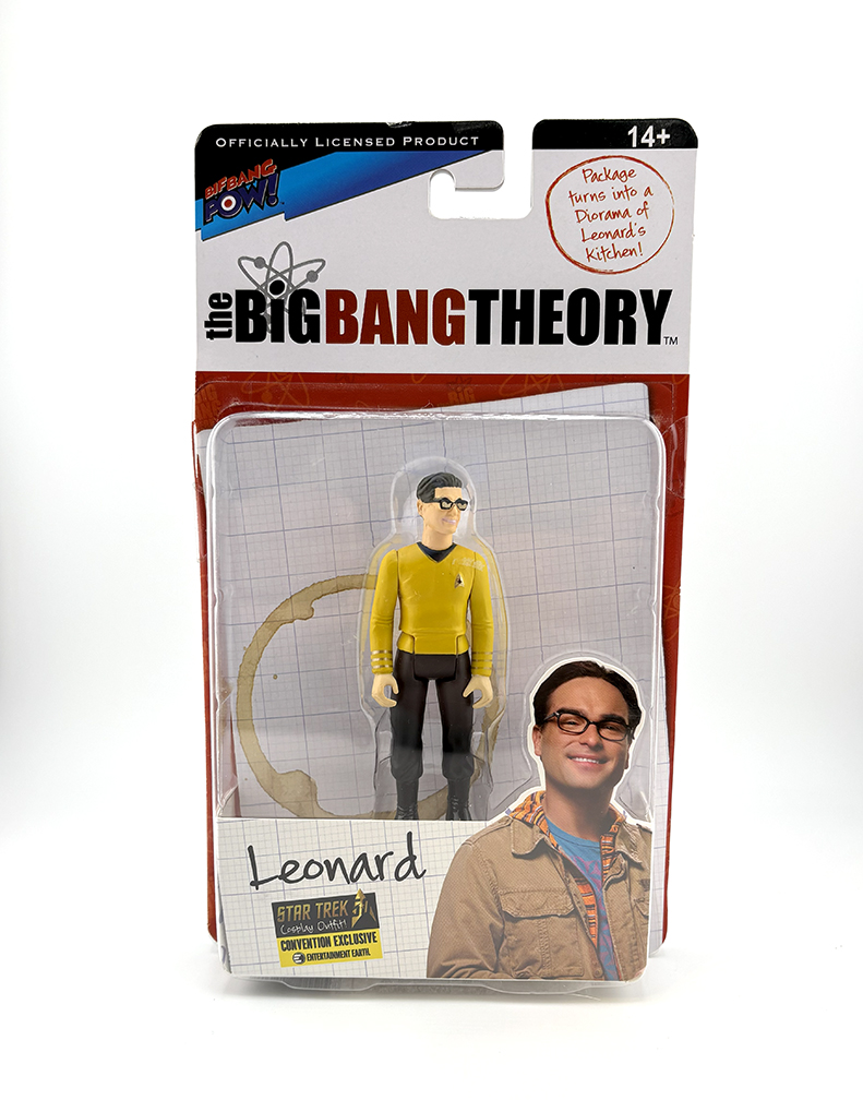 This carded Leonard Hofstadter action figure is dressed in the gold of a Star Trek command level officer. He is mint and comes sealed on his card. This was a 2016 SDCC Entertainment Earth exclusive figure.