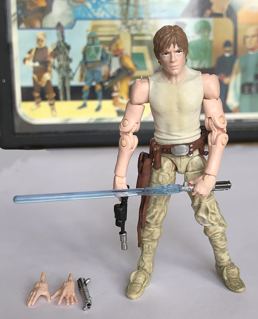 This Star Wars Black series Luke Skywalker in Dagobah fatigues is loose and comes complete with all parts. He is in excellent condition with tight joints and no play wear.